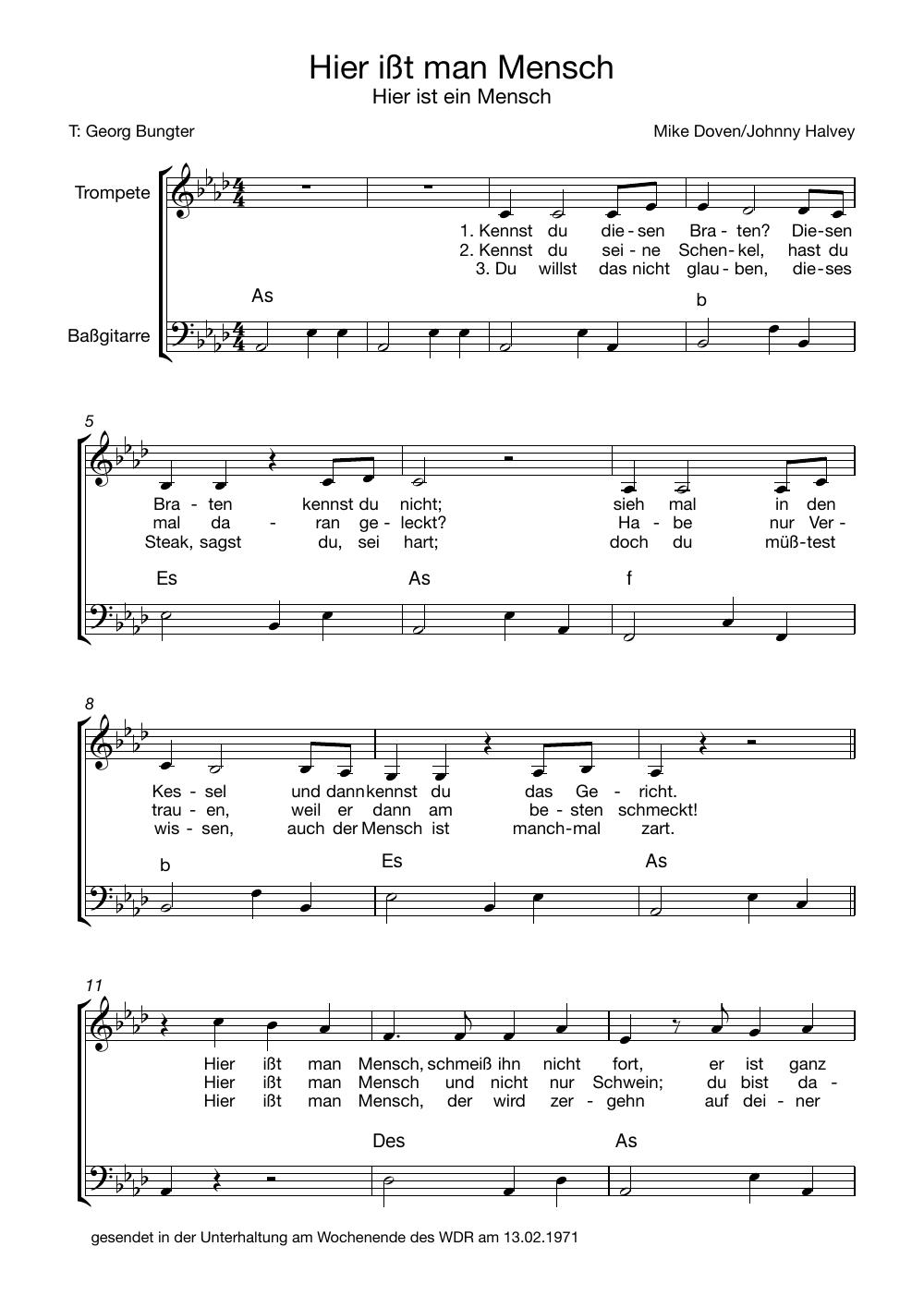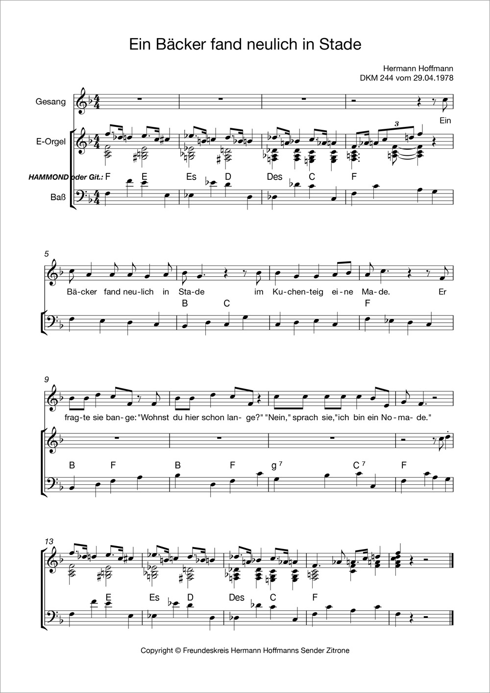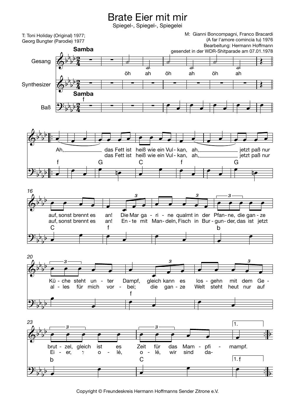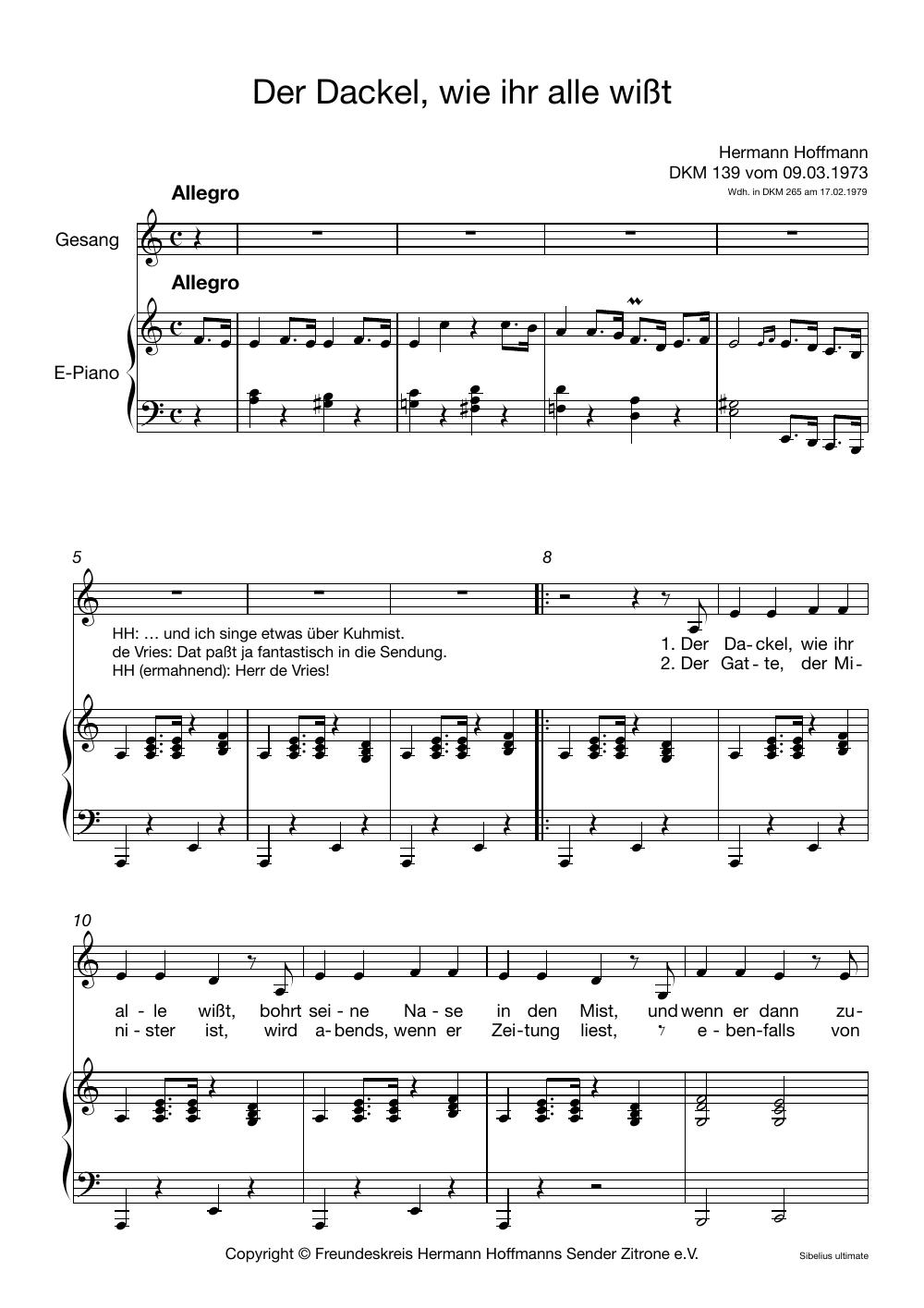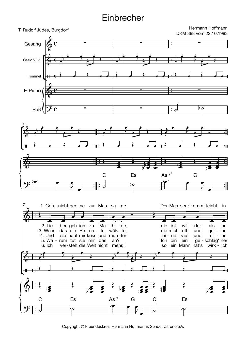Hermann Hoffmann hat Hunderte von Songs geschrieben, die alle in seinen Sendungen vorgestellt wurden und auch den Weg auf LPs und CDs gefunden haben. Sie können diese nun aber nicht nur anhören – wenn Sie selber singen, könnten folgende Noten Ihr Interesse finden. Unser Freundeskreis-Mitglied James Schäfer setzt in unregelmäßiger Folge beliebte Dachkammer- oder andere Songs in Notenform um. Wir wünschen viel Spaß beim Selbersingen!